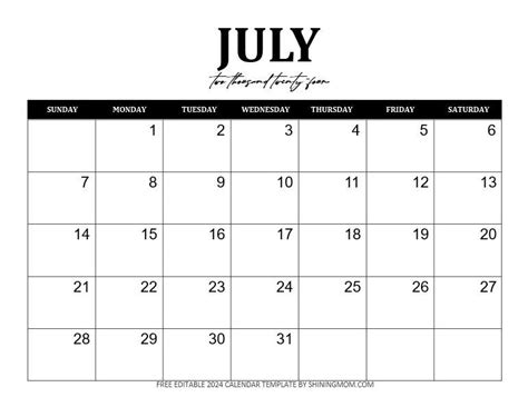 Editable July Calendar