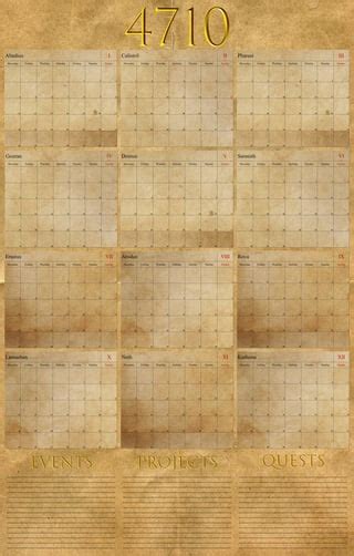 Pathfinder Kingmaker Calendar. Plus festivals and other annual events and observances. Although, some might say this is not very useful, for those who want a clean calendar for the game you might want this.