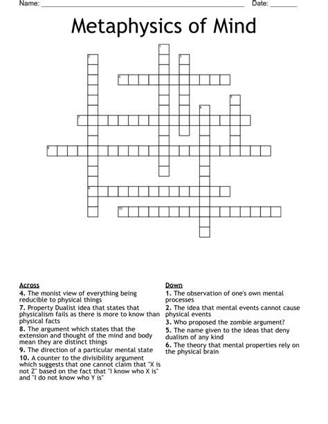 The crossword solver finds answers to. Web variety puzzle misprints (saturday cryptic puzzle, july 1) jun 30, 2023 08:01 pm et crossword writing wrongs (saturday crossword, july 1) jun 30, 2023 08:01 pm et. Web metaphysics subject crossword clue the crossword solver found 30 answers to metaphysics subject, 8 letters crossword clue. This clue was last seen on wall street journal crossword june 29 2020 answers in case the. First of all, we will look for a few extra hints for this entry: Freewill (another definition for freewill that i've seen is this agency of choice.) i've seen this clue in the wall street journal. Web metaphysics topic is a crossword puzzle clue that we have spotted 1 time. 6417 metaphysics topic 19 fine distinction 20 confesosi. The crossword solver finds answers to classic crosswords and cryptic crossword. Web let's find possible answers to metaphysics topic crossword clue. Web the crossword solver found 15 answers to metaphysics, 10 letters crossword clue.