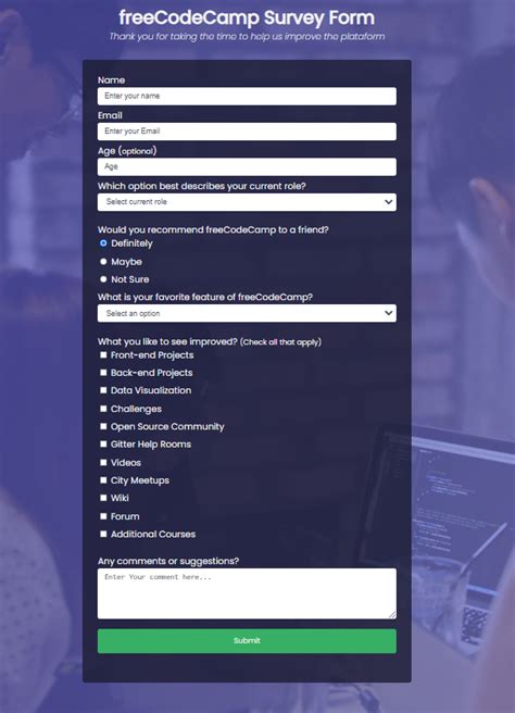 \n inside the form element, you can select an option from a group of at least two radio buttons that are grouped using the name attribute; Though for you to receive the responsive web design certification, you have to complete all five projects given to you throughout the course. Web hello @memojiddah, did you pass the tests regarding the survey form project? Having a hard time with cs50, freecodecamp or odin. Build a survey form guide camperbot august 3, 2019, 5:42am 1 build a survey form hints/solutions are not provided for certification projects as these are intended to be a test of your learning and understanding. Web solution of build a survey form project from freecodecamp build a survey form 🎯 objective: Survey form | project solution. Before i get into the details, let me emphasize: You should have a short explanation in a p element with an id of description; We are not changing the certifications.