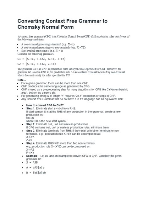In the chomsky normal form (cnf), only three types of rules are allowed: Web the conversion to chomsky normal form hasfour main steps: Web chomsky normal form enables a polynomial time algorithm to decide whether a string can be generated by a grammar. Get rid of all productions. Eliminate start symbol from the rhs. The algorithm is pretty slick if you. Web try converting the given context free grammar to chomsky normal form. A!bcfor some b;c2vwith b;c6= s, a!afor some a2 , or s! Web steps for converting cfg into cnf. Get rid of all productions where rhs is onevariable. Web chomsky normal form step 1 add new start variable step 2 remove all ε rules step 3 remove all unit rules step 4 standard form conversion