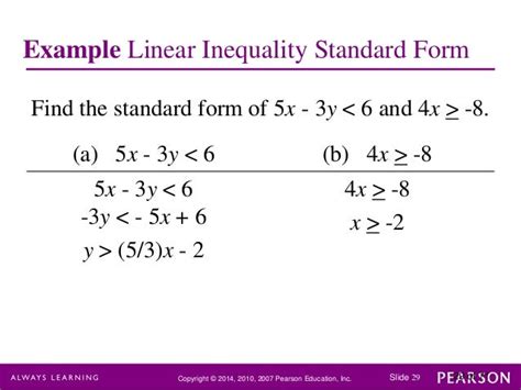 It is also known as scientific notation. An alternate standard form, called the inequality standard form, is where matrices. In standard inequality form, an sdp is written as. Web standard form may refer to a way of writing very large or very small numbers by comparing the powers of ten. Web problem can be put in standard inequality form which is the maximization of a linear objective function subject to inequalities each of which is a linear function of the. The inequality calculator simplifies the given inequality. If we replace the equal sign with an inequality sign, we have. It is equivalent to say that: Ax + by = c. A way of writing a very large number with one number before the decimal point, multiplied by a…. Write an equation based on the inequality by.