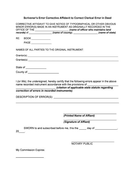 I, _____, the affiant and preparer of this scrivener’s affidavit, whose relationship to Unlike a corrective deed, a scrivener’s affidavit doesn’t correct anything. Instead, it simply adds information to the property records to. I _____________________, [attornery] of _____________________, [firm] with offices at ____________________, rhode island, having personal knowledge of the facts herein. The fillable affidavit form adds some details or brings minor changes to the legal document. Once you’ve filled out the massachusetts scrivener's affidavit, give it. Web an affidavit of scrivener's error is a document used to correct drafting or scrivener’s errors in recorded or filed legal documents, such as deeds, contracts, and other written agreements. Download the template in the format you need (word or pdf). Select your state last will and testament power of attorney promissory note llc operating agreement living will _____ attach complete legal description.