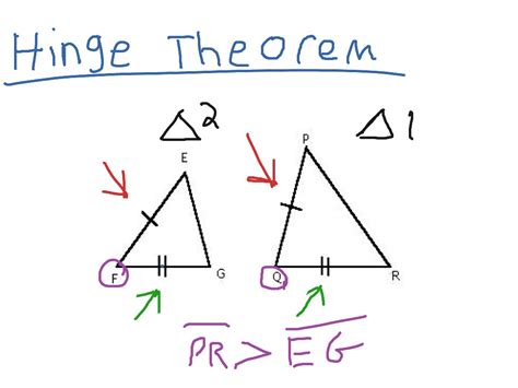 Web the included angle is the angle formed by the two sides of the triangle mentioned in this theorem. In the image below, we can see that since angle d is larger than angle a, side ef is longer than side bc. Follow along with this tutorial to see this theorem used to find the relationship between the sides of two triangles. In geometry, the hinge theorem (sometimes called the open mouth theorem) states that if two sides of one triangle are congruent to two sides of another triangle, and the included angle of the first is larger than the included angle of the second, then the third side of the first triangle is longer than the third side of the. Web hinge theorem is a theorem that compares two triangles and states that if two sides of both triangles are equal, then the length/measure of the third side will depend upon the measure of the interior angle. Web hinge theorem if two sides of one triangle are congruent to two sides of another triangle, and the included angle of the first is greater than the included angle of the second, then the third side of the first is longer than the third side of the second. If one triangle has two sides that are congruent to two sides of another triangle, such that the included angles are different, then the side opposite the larger angle is larger. Web hinge theorem (geometry) mario's math tutoring 281k subscribers 762 53k views 4 years ago geometry learn about the hinge theorem in geometry as well as the converse of the hinge theorem. This theorem is called the hinge theorem because it acts on the principle of the two sides described in the triangle as being hinged at their common vertex. The sides described in this theorem are. Triangle properties 1 vigintillion g (0)=1, g (n+1)=n^2+g (n) cite this as: