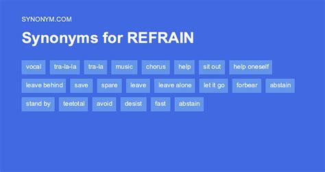 Web find 838 synonyms for refraining and other similar words that you can use instead based on 7 separate contexts from our thesaurus. Here's a list of similar words from our thesaurus that you can use instead. Web synonyms for refrained abstain halt renounce avoid forgo resist desist cease restrain curb forbear quit inhibit pass stop withhold arrest eschew interrupt keep check leave off be temperate give up go on the wagon not do pass up sit out take the cure take the pledge Submitted (to), succumbed (to), yielded (to), bowed (to), surrendered (to), gave in (to), conceded (to), acquiesced (to) Web what is another word for refrain? Web verb definition of refrain (from) as in to keep (from) to resist the temptation of couldn't refrain from ruffling her nephew's neatly combed hair whenever she saw him synonyms & similar words relevance keep (from) avoid withhold (from) abstain (from) forgo forego deny forbear refuse abjure shun check curb constrain inhibit eschew reject combat Kept (from), withheld (from), abstained (from), avoided, denied, abjured, forbore, forwent; Web synonyms for refraining (from): Keeping (from), withholding (from), abstaining (from), avoiding, foregoing, denying, forgoing, forbearing; Submitting (to), yielding (to), bowing (to), surrendering (to), succumbing (to), giving in (to), conceding (to), acquiescing (to)