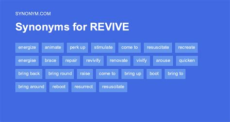 Refreshed, renewed, reborn, energized, resuscitated, recreated, regenerated, rested; Web synonyms & similar words relevance revive recreate refresh renew renovate regenerate replenish repair revitalize redevelop rejuvenate freshen resuscitate revivify recharge reclaim refurbish rehabilitate reconstitute refreshen redesign remodel overhaul recondition reengineer refill remake modernize redo update Kill, suppress, extinguish, quench, faint, pass out, black out Resurrect, renew, rekindle, restart, revitalize, reanimate, resuscitate, rejuvenate; Restore, revive, refresh, recreate, renew, renovate, revitalize, replenish; Drained, weakened, exhausted, weary, tired, dampened, deadened, enervated Draining, weakening, debilitating, deadening, exhausting, numbing, injurious, pernicious More adjective serving to refresh or reinvigorate the body or mind envigorating uk invigorating us refreshing stimulating Web find 1,079 synonyms for revive and other similar words that you can use instead based on 13 separate contexts from our thesaurus. Web what is another word for reviving?