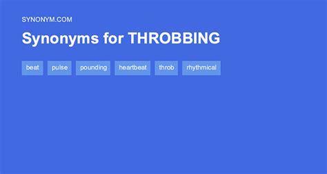 # hurt , shudder pounding n. Having the most intense throbbing agonising pain in my head. On this page you'll find 422 synonyms, antonyms, and words related to throbbing, such as: Web find 1,125 synonyms for throbbing and other similar words that you can use instead based on 13 separate contexts from our thesaurus. Pulsate , pulse beat , pulsate , quiver move with or as if with a regular alternating motion. These are words and phrases related to throbbing. # painful , hurt painful adj. There are drugs you can take to ease the pain. # quiver , rhythm smarting adj. If you sailed through the. # rich , sound pulse n.