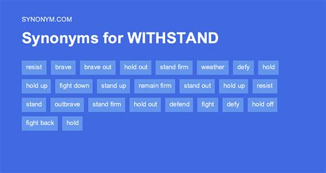 Another Word For Withstand. Web find 2,974 synonyms for withstand and other similar words that you can use instead based on 13 separate contexts from our thesaurus. On this page you'll find 62 synonyms, antonyms, and words related to withstands, such as: