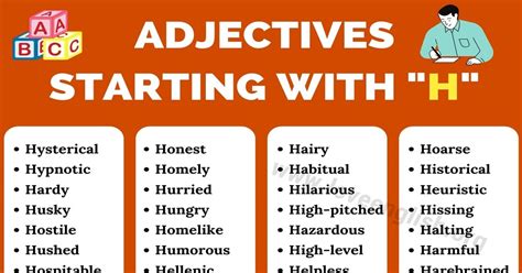 Adjectives describe or modify both nouns and. Web found 33929 words that start with h. Web 14 letter words that start with h. The following list of adjectives that start. Web adjectives that start with h to describe someone. Adjectives describe or modify both nouns and. Descriptive words give a detailed meaning to a noun that must be a person, place or thing. Check our scrabble word finder, wordle solver, words with friends cheat dictionary, and wordhub word solver to find words starting. Web stumped on finding descriptive words that start with h? We use these to describe a thing, place, or person. You are in the right.