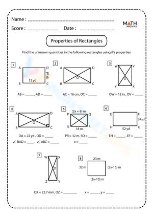 Thus, because there are 180° in a triangle, you can say now plug in 14 for all the x ’s. In a given figure, abcd is a rectangle and its diagonals meet at o. Students can practice the properties of rectangles worksheet: Find the values of x and y. Web focusing on the different types of quadrilaterals, this quiz and corresponding worksheet will help you gauge your knowledge of the properties of rectangles, squares and rhombuses. Web maximize your students learning experience on properties of special parallelograms (squares, rectangles and rhombuses) with this reference sheet and. The first 5 worksheets break. Since the opposite interior angles are equal, it immediately follows that all rectangles are. Web the fundamental properties of rectangles are: Web here’s the solution: Web properties of rectangle worksheet live worksheets > english properties of rectangle properties of rectangle id: