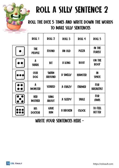 Students can roll and write the silly sentences. Web download the pdf and print the worksheet or just view it on the screen. Web there is room for students to illustrate 4 silly sentences and write each sentence. Students select a green, yellow, and red phrase, build the sentence, read it, draw it, and write it. English as a second language (esl) grade/level: The silly sentence worksheets make writing a whole lot of fun. There are 12 pages of phrases. Web kids love to be silly and adding some silliness to a writing activity can sometimes do the trick for reluctant writers. The activity works on the following skills: You can decide to have your students trace or write depending on their needs.